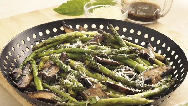 Step3Stir asparagus, basil, salt and pepper into mushrooms until vegetables are coated with seasonings and asparagus is heated through. Sprinkle with cheese and hazelnuts.