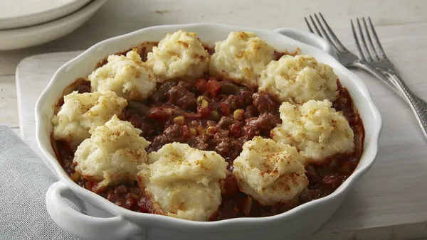 Step2Stir Bisquick mix, milk, butter and eggs until blended. Spoon about two-thirds of the Bisquick mixture onto bottom and half way up side of pan. Spoon beef mixture over Bisquick mixture. Drop remaining Bisquick mixture by spoonfuls to cover beef.