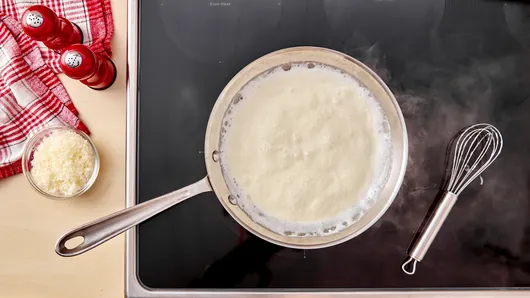 For this alfredo sauce recipe, we start by reducing heavy whipping cream. To achieve a luxuriously creamy alfredo sauce that won’t break as other ingredients are added, real cream is essential.