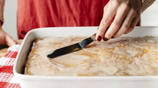 This honey bun cake recipe is known for its moist, bubbly batter, which makes it extra delicious but can sometimes make it prone to uneven baking. Not to worry! Betty’s here to help. To ensure an even bake, just be sure to spread the batter evenly in the pan before popping it into the oven. Since the batter is rich and thick, an offset spatula works perfectly for this task. Use it to gently push and spread the batter into the corners of the pan, making sure it’s level all the way across. Pay close attention to any spots that seem higher or where there’s more batter—this can cause uneven rising and result in a lumpy cake. By taking the time to smooth it out evenly, you’ll get that perfectly baked honey bun cake with a uniform, golden crust. Plus, it helps the signature cinnamon-sugar swirls bake evenly throughout!