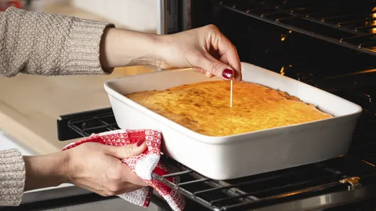 Pop it in the oven for 28 to 32 minutes, or until the cake is golden brown. When you insert a toothpick in the center of the cake, it should come out clean. While the cake is still warm, use a fork to poke holes across the surface. This will allow the luscious glaze to seep in and give your cake that lovely moist texture.