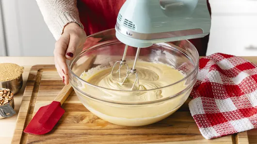 Start by heating your oven to 350°F (or 325°F for dark or nonstick pans). In a large bowl, beat together the cake mix, oil, eggs, and sour cream with an electric mixer on medium speed for 2 minutes. Scrape the bowl as needed to ensure everything is well-mixed.