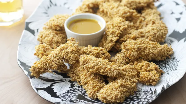 Step3Place bread crumbs in large resealable plastic food-storage bag. Add chicken pieces to mustard mixture; stir to coat. Shake chicken pieces in bag of bread crumbs until coated. Place on cookie sheet. Discard any remaining honey mustard and bread crumbs.
