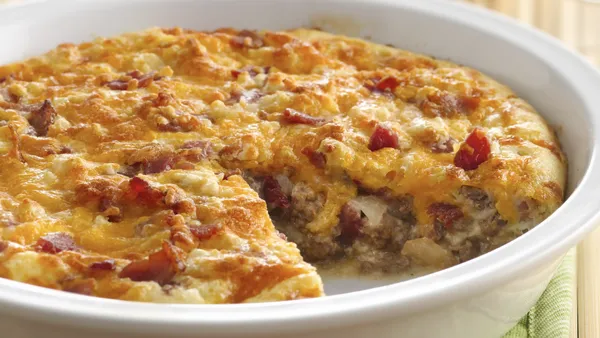 Step2Mix bacon, onions and bell peppers in pie plate. Sprinkle with cheese. Stir remaining ingredients in medium bowl until blended. Pour into pie plate.