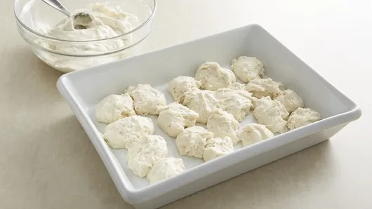 Step1Heat oven to 375°F. Spray 13x9-inch (3-quart) glass baking dish with cooking spray. In medium bowl, stir Bisquick™ mix and milk until soft dough forms. Drop half of dough by tablespoonfuls evenly into bottom of baking dish (dough will not completely cover bottom of dish).