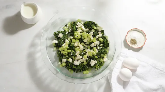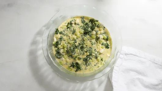 Mix spinach, cheese, and onions in pie plate.
