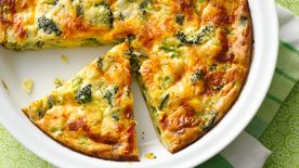 Step1Heat oven to 400°. Grease pie plate, 9x1 1/4 inches. Mix spinach, cheese and onions in pie plate.