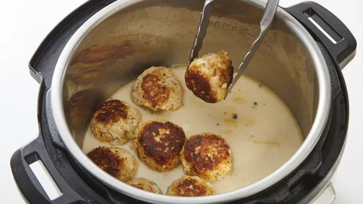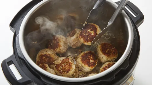 Step2On 6-quart Instant Pot®, select SAUTE; adjust to normal. Heat oil in insert until very hot. Add meatballs; cook 4 to 5 minutes without moving, until meatballs release easily from bottom of insert. Turn; cook 2 to 3 minutes or until browned on second side. Turn one more time; cook 2 to 3 minutes on third side, until browned. Select CANCEL. Using slotted spoon or tongs, transfer meatballs to plate.