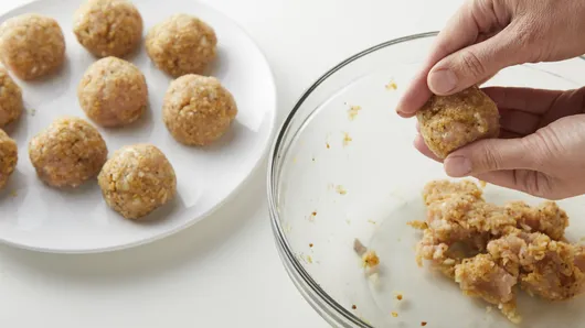 Step1In large bowl, mix turkey, bread crumbs, onion, egg, garlic, Worcestershire sauce, salt and 1/4 teaspoon of the pepper. Shape mixture into 12 (2-inch) meatballs.