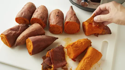 Step1In 6-quart Instant Pot™ insert, place water. Place rack in insert. Poke potatoes all over with paring knife; place on rack. Secure lid; set pressure valve to SEALING. Select MANUAL; cook on high pressure 15 minutes. Select CANCEL. Set pressure valve to VENTING to quick-release pressure. Place potatoes on cutting board. Remove rack, and drain off cooking liquid. When cool enough to handle, peel potatoes and set aside.