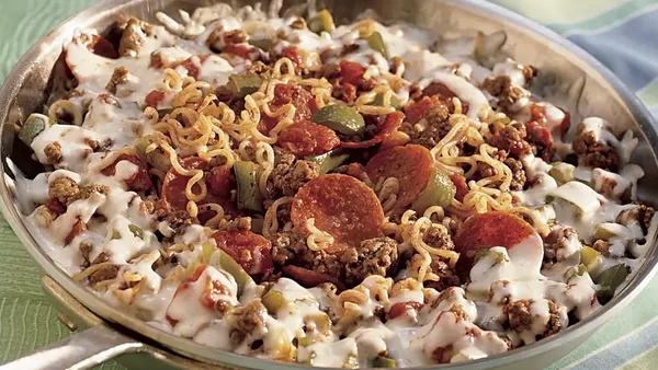 Step1In 12-inch skillet, cook bacon over medium-high heat until almost crisp. Add beef, onion, bell pepper, garlic and salt; cook 5 to 7 minutes, stirring frequently, until beef is thoroughly cooked; drain.