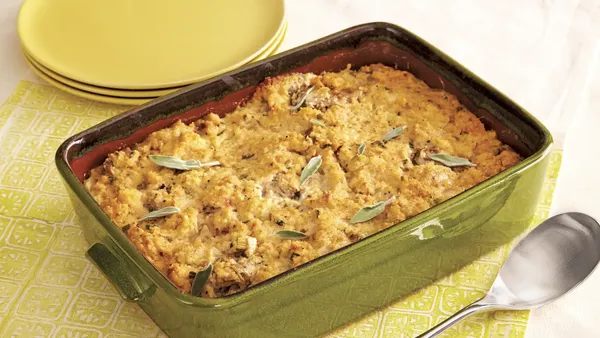 Step4Spray 13x9-inch (3-quart) glass baking dish with cooking spray. Spoon dressing into baking dish. Bake uncovered 40 to 45 minutes or until golden brown.