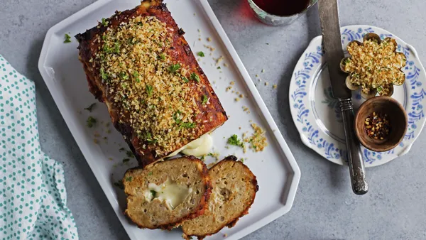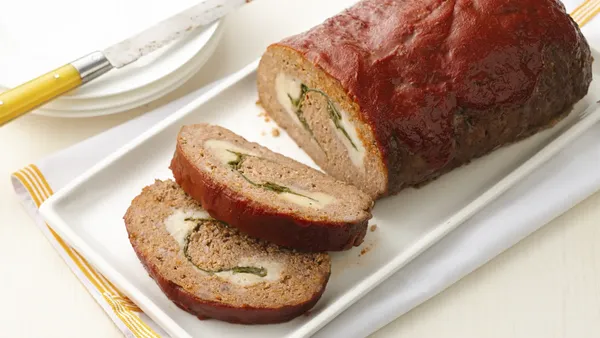 Cut slices of this juicy meatloaf, intensely flavored with herbs and prepared roasted peppers, to reveal a luscious center of melted cheeses.