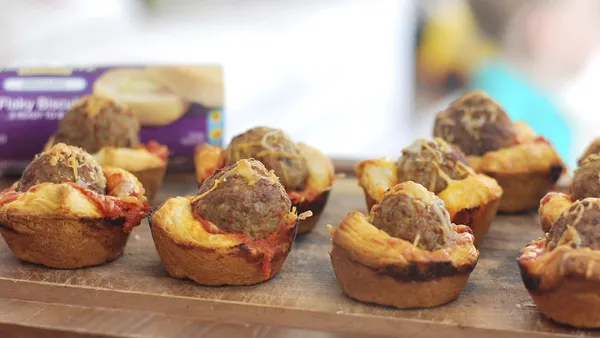 Step2Place 4 meatball halves lengthwise down center of each rectangle. Top each with 2 tablespoons pasta sauce and 2 tablespoons mozzarella cheese. Make cuts 1 inch apart on each side of filling, using sharp knife. Alternately cross strips over filling. Brush dough with beaten egg; sprinkle with Parmesan cheese.