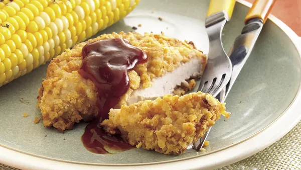 Step1Place Bisquick mix, dressing and bread crumbs in separate shallow bowls. Coat pork chops with Bisquick mix. Dip coated pork chops into dressing, then coat with bread crumbs.