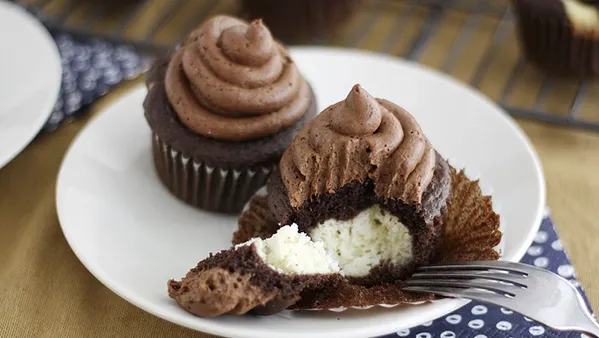 The layered flavors of Italian spumoni ice cream is captured in cupcake form thanks to layers of white cake, pistachio pudding and pie filling, cherry juice and chocolate frosting.