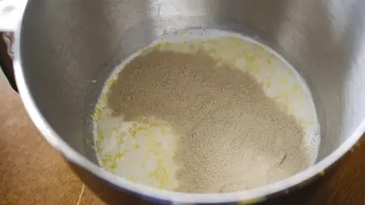 Step1In large bowl, stir together milk, 1/2 cup granulated sugar, the yeast, lemon peel and vanilla. Let stand 5 minutes for yeast to dissolve.