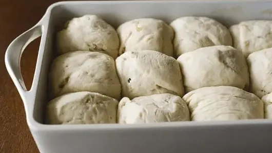 Step3Grease bottom and sides of 13x9-inch pan with shortening or cooking spray. Gently push fist into dough to deflate. Divide dough into 15 equal pieces. Shape each piece into a ball; place in pan. Cover loosely with plastic wrap; let rise in warm place about 45 minutes or until dough has doubled in size.