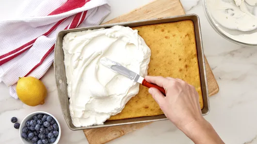 Once the cake is cool and the topping is ready, spread the fluffy whipped topping evenly over the cake using an icing spatula. Then, sprinkle fresh blueberries and grated lemon peel for a burst of color and extra citrus flavor. For an added touch, use a citrus zester to create long curls from the lemon rind. This simple decoration makes the cake as beautiful as it is delicious.
