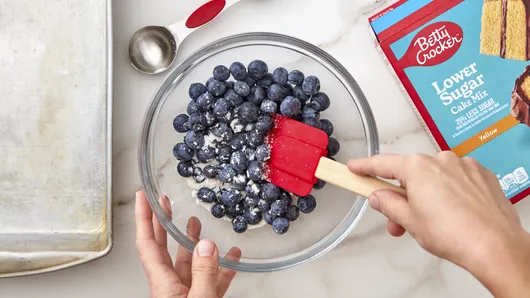 Toss your fresh blueberries with a small amount of the dry cake mix. (Save the rest of the cake mix for the batter.) This helps prevent the blueberries from sinking to the bottom of the batter, keeping them well spread throughout the cake. If you're using jumbo blueberries, they might still sink a bit, but don’t panic—your cake still will turn out delicious.