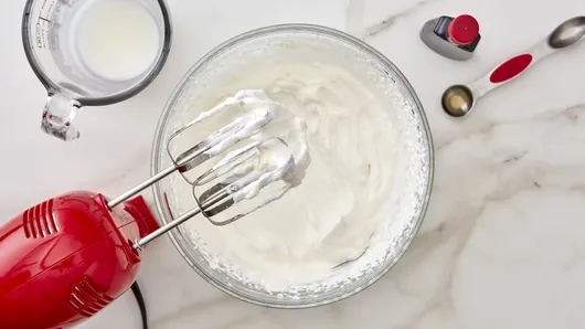 While the cake cools, make the whipped topping by beating heavy cream and vanilla in a chilled bowl until stiff peaks form. To check for stiff peaks, turn a hand mixer upright—if the whipped cream stands straight up in a defined peak from the beater, it’s ready. If not, continue beating briefly—you're close, and you don't want to overbeat. The whipped cream should be thick, fluffy, and airy—perfect for spreading on the cooled cake. No mixer? No problem—use a wire whisk and whip it by hand, though it will take a bit longer.
