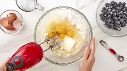 Beat all the cake ingredients in a large bowl, except the fresh blueberries, until the batter is smooth and well mixed. This should take about 2 minutes; be sure to scrape down the sides of the bowl to ensure everything is fully combined with no lumps or dry mix left.