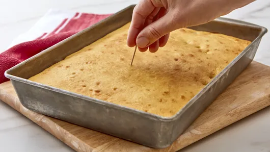 Let the cake cool completely on a cooling rack for about 2 hours. It’s important to cool the cake fully before adding the topping, as warmth can cause the whipped topping to become soupy.