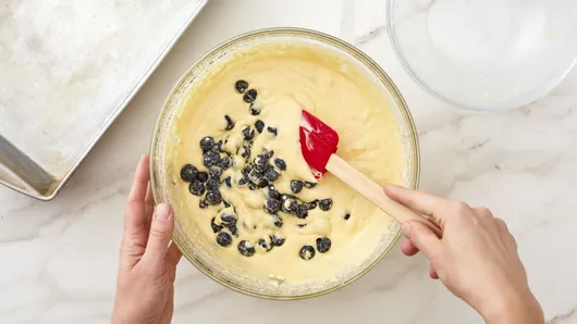 Step3Gently stir in coated blueberries and any remaining dry cake mix. Pour into pan.