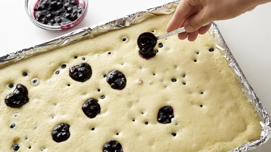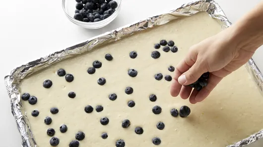 Heat oven to 425°F. Line 15x10x1-inch jelly roll pan with foil; spray with cooking spray. In large bowl, beat Bisquick™ mix, milk, eggs, granulated sugar and melted butter with whisk until blended. Stir in 1 tablespoon of the lemon zest. Spread in pan. Top with blueberries. Bake 6 minutes.