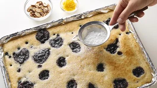 var configuration = {"title":"Lemon-Blueberry Sheet-Pan Pancake","introduction":"Skip the griddle! This fluffy, sweet oven-baked pancake will save you from flipping cakes for everyone. Instead, mix up the batter and bake off this sheet pan-sized pancake in the oven. While cooks will appreciate the efficiency of this recipe, everyone around the table will appreciate its flavor. The combination of fresh blueberries and lemon zest provides a pleasant, slightly tangy contrast to the sweet blueberry preserves and pancake base. This well-balanced flavor is appealing to adults and still plenty kid-friendly, too. So, whether it’s Christmas morning and you don’t want to miss a minute of the new-toy joy, or you’re just trying to streamline the breakfast routine, it’s worth adding this to your recipe box.","servingSize":"3 Pancakes","image":{"small":{"media":"(min-width: 0px)","src":"https://mojo.generalmills.com/api/public/content/g3uzqrSn70uw36BuXWMSGg_webp_base.webp?v=744628df\u0026t=e724eca7b3c24a8aaa6e089ed9e611fd"},"medium":{"media":"(min-width: 500px)","src":"https://mojo.generalmills.com/api/public/content/g3uzqrSn70uw36BuXWMSGg_webp_base.webp?v=744628df\u0026t=191ddcab8d1c415fa10fa00a14351227"},"large":{"media":"(min-width: 767px)","src":"https://mojo.generalmills.com/api/public/content/g3uzqrSn70uw36BuXWMSGg_webp_base.webp?v=744628df\u0026t=191ddcab8d1c415fa10fa00a14351227"},"alt":"Lemon-Blueberry Sheet-Pan Pancake"},"contributor":{"label":"By","name":"Betty Crocker Kitchens","profileUrl":"/about-us","displayDate":{"label":"Updated","date":"Oct 27, 2019"}},"ingredientGroups":[{"ingredients":[{"quantity":"2 ","description":"cups Original Bisquick™ mix ","productLink":"/products/bisquick/bisquick-original"},{"quantity":"1 ","description":"cup milk "},{"quantity":"2 ","description":"eggs, slightly beaten "},{"quantity":"1/4 ","description":"cup granulated sugar "},{"quantity":"3 ","description":"tablespoons butter, melted "},{"quantity":"2 ","description":"tablespoons lemon zest "},{"quantity":"1 ","description":"cup fresh blueberries "},{"quantity":"1/2 ","description":"cup blueberry spreadable fruit"},{"quantity":"1/4 ","description":"cup toasted sliced almonds, if desired"},{"quantity":"1 ","description":"tablespoon powdered sugar "}]}],"steps":[{"description":"Heat oven to 425°F. Line 15x10x1-inch jelly roll pan with foil; spray with cooking spray. In large bowl, beat Bisquick™ mix, milk, eggs, granulated sugar and melted butter with whisk until blended. Stir in 1 tablespoon of the lemon zest. Spread in pan. Top with blueberries. Bake 6 minutes. ","stepShotImageUrl":"//mojo.generalmills.com/api/public/content/4AzrjohNF0O22gSfST2XrA_webp_base.webp?v=39043231\u0026t=51a43a57af4046789e5a7f20567b1195"},{"description":"Spoon teaspoonfuls of blueberry spreadable fruit over pancake batter. Bake 7 to 11 minutes longer or until golden brown and toothpick inserted in center comes out clean. ","stepShotImageUrl":"//mojo.generalmills.com/api/public/content/8BRviLf9JUGkKEj6eTJZ0A_webp_base.webp?v=bf0668b9\u0026t=51a43a57af4046789e5a7f20567b1195"},{"description":"Sprinkle with powdered sugar. Top with almonds. Top with remaining 1 tablespoon lemon zest. To serve, cut 6 rows by 4 rows. For each serving, place 3 pancakes on individual serving plate. ","stepShotImageUrl":"//mojo.generalmills.com/api/public/content/g5RNHnD5wEC0NRs6VyoyUw_webp_base.webp?v=6a95a1d9\u0026t=51a43a57af4046789e5a7f20567b1195"}],"tips":[{"title":"","description":"Kitchen Tested: 8/2019","category":"Kitchen Tested","tipShots":[]},{"title":"","description":"Lining your jelly roll pan with foil makes cleanup a breeze. Just don’t forget the cooking spray!","category":"Techniques","tipShots":[]},{"title":"","description":"If you’re able to buy smaller blueberries, we really prefer them in this recipe, as they tend to get juicier in the oven and might even burst for a pretty, saucy look.","category":"Recipe/Ingredient Facts","tipShots":[]},{"title":"","description":"Use a small mesh sieve to sprinkle the pancake with powdered sugar before serving. For an extra-pretty presentation, hold your sieve higher—about 2 feet above the pancake—to create an even dusting of powdered sugar.","category":"Presentation/Garnish","tipShots":[]},{"title":"","description":"This sheet-pan pancake is delicious without syrup. But if you can’t eat pancakes without it, there’s nothing wrong with serving this alongside a jug of syrup.","category":"Serving Suggestions/Menu","tipShots":[]}],"kitchenTips":[{"title":"","description":"Lining your jelly roll pan with foil makes cleanup a breeze. Just don’t forget the cooking spray!","category":"Techniques","tipShots":[]},{"title":"","description":"If you’re able to buy smaller blueberries, we really prefer them in this recipe, as they tend to get juicier in the oven and might even burst for a pretty, saucy look.","category":"Recipe/Ingredient Facts","tipShots":[]},{"title":"","description":"Use a small mesh sieve to sprinkle the pancake with powdered sugar before serving. For an extra-pretty presentation, hold your sieve higher—about 2 feet above the pancake—to create an even dusting of powdered sugar.","category":"Presentation/Garnish","tipShots":[]},{"title":"","description":"This sheet-pan pancake is delicious without syrup. But if you can’t eat pancakes without it, there’s nothing wrong with serving this alongside a jug of syrup.","category":"Serving Suggestions/Menu","tipShots":[]}],"additionalContent":[],"faq":[],"tipCategories":[{"categoryName":"Kitchen Tested","heading":"More About This Recipe","cssClass":"recipePartStory","expandOnInit":false,"expandText":"More +","collapseText":"Less -","expandEventName":"","collapseEventName":"","image":"","tips":[{"title":"","description":"Kitchen Tested: 8/2019","category":"Kitchen Tested","tipShots":[]}],"isExpandable":false}],"nutritionInfo":{"configuration":{"showAsTable":false,"noNutritionInformationAvailableMessage":"Nutrition F