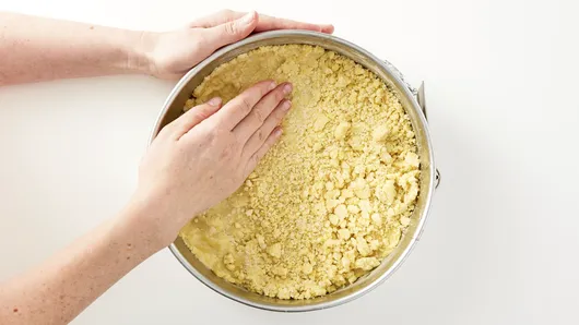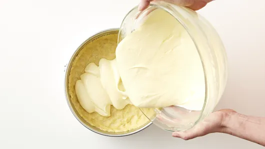Step1Heat oven to 300°F. Wrap outside bottom and side of 10-inch springform pan with 2 layers of heavy duty foil to prevent leaking. Spray inside of pan with cooking spray. Reserve 1/4 cup of the cake mix; set aside. In large bowl, beat remaining cake mix, oil, 1 egg and lemon peel with electric mixer on low speed until crumbly. Press firmly in bottom and 1 inch up side of pan.