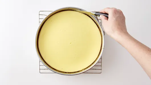 Step4Remove cheesecake from oven; place on cooling rack. Without releasing side of pan, run knife around edge of pan to loosen cheesecake. Cool in pan on cooling rack 30 minutes. Refrigerate uncovered at least 4 hours or overnight before serving.