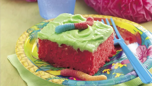 Bake 30 to 35 minutes or until toothpick inserted in center comes out clean. Cool 30 minutes. Refrigerate at least 4 hours to chill. Spread whipped topping over chilled cake. Sprinkle with additional lemon and lime peel. Using a serving spatula and a knife to carefully help slide pieces off, cut into 6 rows by 3 rows. Store loosely covered in refrigerator.