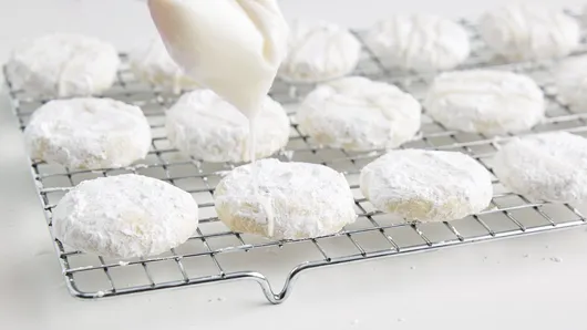 Step4In small bowl, beat 1 cup powdered sugar and 1 tablespoon of the lemon juice with spoon until smooth. If too stiff to drizzle, add additional lemon juice, 1 teaspoon at a time. Spoon into resealable food-storage plastic bag; partially seal bag. Cut small tip from corner of bag; pipe over tops of cookies. Let stand about 1 hour or until icing is set. Store covered in airtight container.