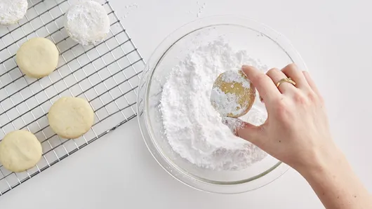Step3Bake 6 to 8 minutes or until edges are set but not brown. Cool 2 minutes on cookie sheet; remove from cookie sheet to cooling rack. In small bowl, place 1 1/2 cups powdered sugar. Roll each warm cookie in powdered sugar, and place on cooling rack. Cool completely, about 30 minutes. Roll cookies again in powdered sugar to coat.