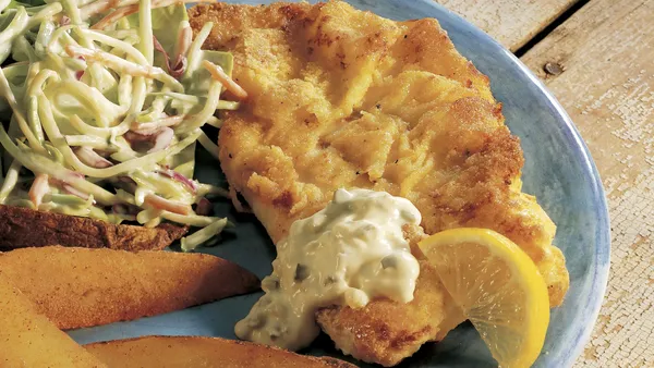 Step2Stir Bisquick mix, cornmeal, lemon pepper seasoning salt and salt. Mix egg and water. Dip fish into egg mixture, then coat with Bisquick mixture. Place in pan.