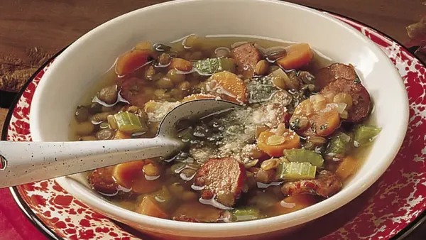 Step3Into same saucepan, pour remaining 2 cups water. Stir in all remaining ingredients except bratwurst and spinach. Heat to boiling. Reduce heat; cover and simmer 1 hour 15 minutes to 1 hour 30 minutes or until lentils are tender.