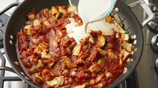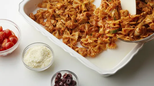 var configuration = {"title":"Lighter Mediterranean Pasta Bake ","introduction":"Next time you’re craving a comforting casserole loaded with chicken, veggies and just enough cheese to make it feel decadent, we recommend giving this recipe a try. It’s a lightened-up take on a favorite recipe, our \u003ca href=\u0022https://www.bettycrocker.com/recipes/mediterranean-chicken-pasta-bake/d9ef9ef2-6369-462b-b753-965793af808b\u0022\u003eMediterranean Chicken Pasta Bake\u003c/a\u003e. Like the original, this lighter version features perfectly browned chicken, bowtie pasta and the sun-ripened flavors of tomatoes, olives and artichokes featured in the original—but we also added in a few more veggies and trimmed down the cheese. The result is a dish that’s full-flavored and comforting. When it comes out of the oven all warm and melty, no one will guess this dinner comes in under 400 calories per serving!","servingSize":"About 1 1/3 Cups","image":{"small":{"media":"(min-width: 0px)","src":"https://mojo.generalmills.com/api/public/content/VPv2lAiMMEeBmDSdC4dIjg_webp_base.webp?v=528a59d8\u0026t=e724eca7b3c24a8aaa6e089ed9e611fd"},"medium":{"media":"(min-width: 500px)","src":"https://mojo.generalmills.com/api/public/content/VPv2lAiMMEeBmDSdC4dIjg_webp_base.webp?v=528a59d8\u0026t=191ddcab8d1c415fa10fa00a14351227"},"large":{"media":"(min-width: 767px)","src":"https://mojo.generalmills.com/api/public/content/VPv2lAiMMEeBmDSdC4dIjg_webp_base.webp?v=528a59d8\u0026t=191ddcab8d1c415fa10fa00a14351227"},"alt":"Lighter Mediterranean Pasta Bake "},"contributor":{"label":"By","name":"Betty Crocker Kitchens","profileUrl":"/about-us","displayDate":{"label":"Updated","date":"Nov 22, 2019"}},"ingredientGroups":[{"ingredients":[{"quantity":"8","description":"oz uncooked bowtie pasta (about 3 cups) "},{"quantity":"1","description":"tablespoon olive oil"},{"quantity":"1","description":"lb boneless skinless chicken breasts, cut into 1-inch cubes "},{"quantity":"1/2","description":"teaspoon Italian seasoning"},{"quantity":"1/4","description":"teaspoon salt"},{"quantity":"1","description":"cup chopped onions"},{"quantity":"1","description":"small zucchini, cut in half lengthwise and into 1/4-inch slices (about 1 1/2 cups)"},{"quantity":"2","description":"jars (6 oz each) Progresso™ imported marinated artichoke hearts, drained and chopped"},{"quantity":"2","description":"cups Muir Glen™ organic tomato basil pasta sauce (from 25.5-oz jar)"},{"quantity":"1/2","description":"cup heavy whipping cream"},{"quantity":"1","description":"cup halved cherry tomatoes"},{"quantity":"1/4","description":"cup sliced kalamata olives"},{"quantity":"1/2","description":"cup grated Parmesan cheese"}]}],"steps":[{"description":"Heat oven to 350°F. Spray 13x9-inch (3-quart) glass baking dish with cooking spray. Cook and drain pasta as directed on package. Add to large bowl."},{"description":"In 12-inch nonstick skillet, heat 1 teaspoon oil over medium-high heat. Toss chicken with Italian seasoning and salt; cook 8 to 10 minutes, stirring occasionally, until juice of chicken is clear when center of thickest part is cut (at least 165°F). Transfer to bowl with pasta.","stepShotImageUrl":"//mojo.generalmills.com/api/public/content/9GRVZxtMXU-ozj9BnHmuow_webp_base.webp?v=998e7014\u0026t=51a43a57af4046789e5a7f20567b1195"},{"description":"In same skillet, heat remaining 2 teaspoons oil over medium heat; add onions and zucchini. Cook 4 to 6 minutes, stirring occasionally, until vegetables are crisp-tender. Stir in artichokes, pasta sauce and whipping cream; heat 3 to 4 minutes or until heated through.","stepShotImageUrl":"//mojo.generalmills.com/api/public/content/6Er7DTHzgk6FSXLc2DznFg_webp_base.webp?v=7e745c74\u0026t=51a43a57af4046789e5a7f20567b1195"},{"description":"Carefully add sauce to bowl of pasta and chicken; stir until well combined. Spoon mixture into baking dish; top with tomatoes, olives and Parmesan cheese. Cover baking dish with foil; bake 25 minutes. Uncover; bake 10 to 15 minutes or until bubbly and lightly browned.","stepShotImageUrl":"//mojo.generalmills.com/api/public/content/ulCS0xcMs0iT49Sci_G-hA_webp_base.webp?v=ae11baca\u0026t=51a43a57af4046789e5a7f20567b1195"}],"tips":[{"title":"","description":"Jarred olives are perfect in this dish. Save the premium ones from the olive bar for enjoying on a grazing board or on top of your salad.","category":"Recipe/Ingredient Facts","tipShots":[]},{"title":"","description":"It’s important to make sure the pasta is well coated with sauce before baking. This will help ensure it cooks up tender and doesn’t dry out.","category":"Techniques","tipShots":[]},{"title":"","description":"No bowties? Substitute whatever short-shaped pasta you have on hand.","category":"Substitution","tipShots":[]},{"title":"","description":"Kitchen Tested: 10/2019","category":"Kitchen Tested","tipShots":[]},{"title":"","description":"Who knew a recipe featuring pasta and cheese could come in under 400 calories? Part of the trick is including ingredients that collapse in on themselves when baked, so there’s an overall velvety texture to the dish—zucchini, tomatoes, marinated artichokes. Working together, they make that half-cup of cream seem like so much more. And if you’re counting calories, that’s a very good thing!","category":"Editorial","tipShots":[]}],"kitchenTips":[{"title":"","description":"Jarred olives are perfect in this dish. Save the premium ones from the olive bar for enjoying on a grazing board or on top of your salad.","category":"Recipe/Ingredient Facts","tipShots":[]},{"title":"","description":"It’s important to make sure the pasta is well coated with sauce before baking. This will help ensure it cooks up tender and doesn’t dry out.","category":"Techniques","tipShots":[]},{"title":"","description":"No bowties? Substitute whatever short-shaped pasta you have on hand.","category":"Substitution","tipShots":[]}],"additionalContent":[],"faq":[],"tipCategories":[{"categoryName":"Edit