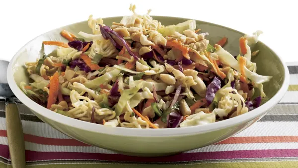 Put a spin on ramen-style salads with lo mein noodles, edamame and a savory peanut butter dressing.
