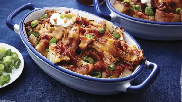 Start with sour cream-and-cheddar-spiked mashed potatoes, then load up on barbecue chicken, bacon and more cheese for an irresistibly indulgent dinner that’s on the table in under an hour.