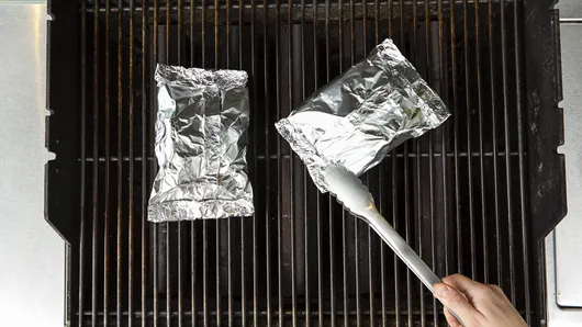 Step4Bring up 2 sides of foil so edges meet. Seal edges, making tight 1/2-inch fold; fold again, allowing space for heat circulation and expansion. Fold other sides to seal.