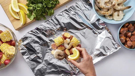 Step3Place equal amount of sausage on center of each sheet of foil. Dividing evenly, arrange potato and corn mixture around sausage. Divide shrimp evenly over sausage. Squeeze 1 wedge of lemon over each pack.