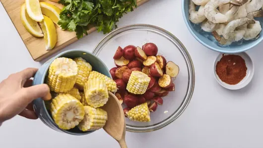 Step2Place potatoes in microwavable bowl. Microwave uncovered on High 5 to 6 minutes or until potatoes are just tender. Add corn to potatoes; drizzle with 1 teaspoon of the oil, and sprinkle with 1 teaspoon of the seasoning; mix until evenly coated. Place shrimp in medium bowl; toss with remaining 1 teaspoon oil and remaining 1 teaspoon seasoning; mix until evenly coated.