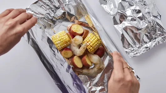 This foil pack version of the Southern classic low country shrimp boil brings together andouille sausage, corn on the cob and baby red potatoes.