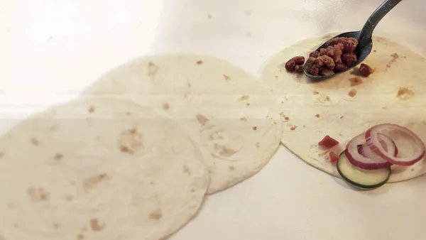 Step3Heat tortillas as directed on package. Spread 2 tablespoons of the beans in middle of each tortilla, leaving 1-inch border around edges. Sprinkle 2 tablespoons cheese over beans. Spoon 1/4 cup beef mixture and 2 tablespoons rice mixture evenly down center of each. Fold bottom of each tortilla 1 inch over filling. Fold sides in, overlapping to enclose filling. Fold top over sides.