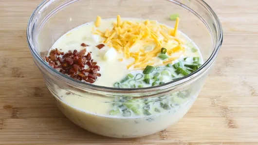 Step1Preheat the oven to 350°F. Whisk the eggs, milk, salt and pepper together in a large mixing bowl. Add the cheese, hash browns, green onions, and crumbled bacon and stir to combine.