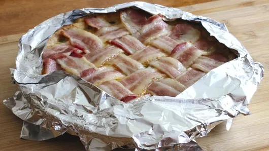Step5Cover the edges of the pie with aluminum foil to prevent burning. Note: The bacon will shrink a lot, so its fine that the bacon is hanging over the sides.Return the pie to the oven and bake for 10-15 minutes or until the bacon is done. Tip pie dish carefully to drain any bacon grease. (If you like extra crispy bacon you could put the pie under the broiler for a couple of minutes, or until the bacon has reached your preferred doneness.)