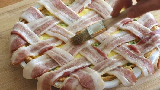 Step4Weave the bacon into a lattice on top of the pie. Brush each strip of bacon with maple syrup.