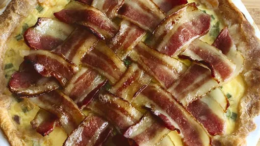 Take all your favorite breakfast ingredients -– bacon, eggs, hash browns, cheese, milk – and combine them into a glorious breakfast pie. Then add a bacon lattice on top and the creation is complete!