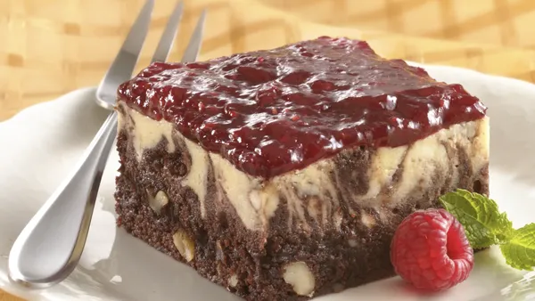 Step3Let stand at room temperature about 10 minutes before cutting. Dip knife into hot water, then run knife along side of dessert to loosen. Top dessert with fruit; drizzle with chocolate syrup. Store covered in freezer.